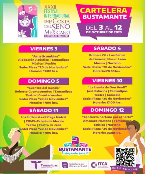 Del 3 al 12 de octubre de 2025, nuestro municipio será parte del XXXII Festival Internacional en la Costa del Seno Mexicano, un evento que enorgullece a Tamaulipas y que se ha consolidado como una de las celebraciones culturales más importantes de la región.